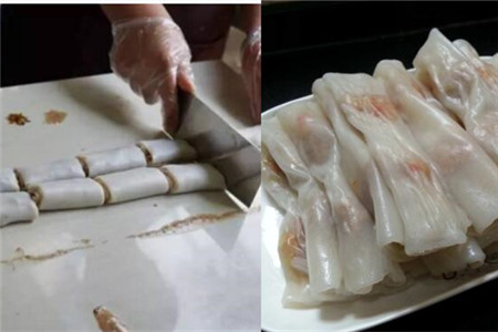 蒸好肠粉之后,我们将肠粉用铁片把它刮下来。然后将肠粉,卷成长条状。将它们切成适合吃的长度。在卷的时候一定要注意,不要将肠粉弄破,将肠粉弄破之后,不仅会造成其中的食材露出来,不方便食用,还会造成影响肠粉的美观,所以我们在刮肠粉的时候要特别的小心。可以贴着边沿慢慢地刮,不要因为心急导致肠粉被弄破。