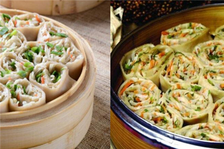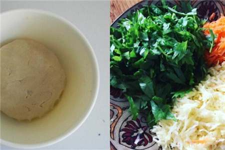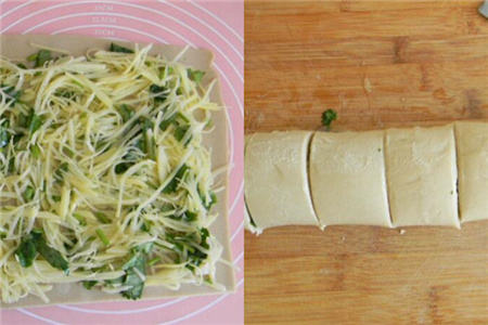 香菜、胡萝卜和土豆都刨成细丝,将所有的蔬菜丝按照顺序依次铺在面皮上。接着在上面撒一点点芝麻香油和芝麻,将面片慢慢的卷起来。