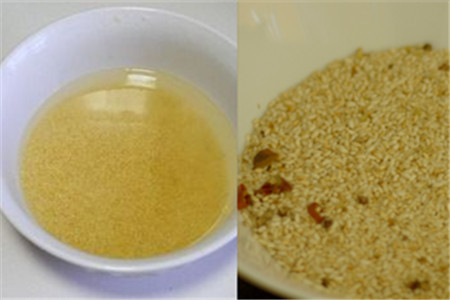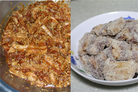 然后我们在处理好的五花肉上适量的盐、酱油、腐乳汁、姜末,黄酒,白糖、甜面酱,将它们一起搅拌均匀,然后腌制十分钟。在腌制五花肉的十分钟内,我们可以在锅中加入米粉,翻炒五分钟,等到米粉变成黄色的时候,我们在米粉中加入丁香,桂皮,八角,然后再将它们炒均匀。我们将米粉从锅中盛出来。我们将炒好的米粉碾制成细米粉,放在一旁备用。