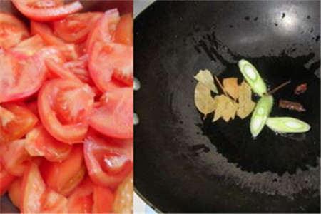 我们把西红柿划几刀,把它放在热水里面泡一会,再拿起来把皮给去掉,热水烫过的西红柿非常好去皮。去好皮后,就把它切成好装盘。我们把锅给准备好,再把生姜,大葱,蒜切好,等锅烧热后,就把生姜,大葱,蒜倒进锅中爆炒,再倒入生抽,老抽,料酒,来回的翻炒。翻炒一会后,把八角,桂皮等香料一起加进去调味。