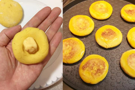 取适量小面团,将芝士球包入面团中,把面团揉成球状再压成饼。电饼铛提前加热,倒入少许油,放入做好的面饼,煎至焦黄熟透后装盘,撒上一些糖粉即可。