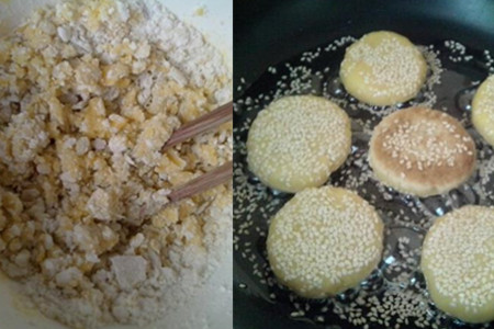 食材:熟地瓜200克、面粉80克、糯米粉30克、葵花籽油、糖粉、芝麻、蛋黄、油。