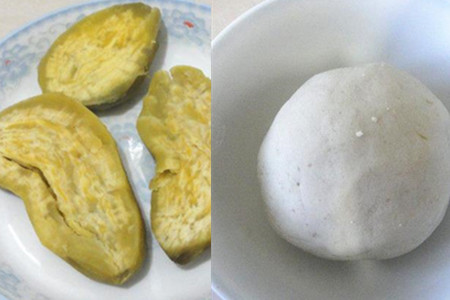 蛋黄加入糖粉,搅匀待用。熟地瓜用勺子黏成泥状,加入适量面粉和糯米粉,搅匀,倒入调好的蛋黄液,搅拌均匀,揉成柔滑并且软硬适中的面团。