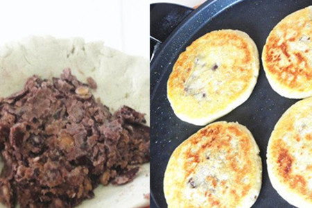 取一小团面团,用手按压成饼状,放上准备好的红豆馅,封好口,再按压成饼状。电饼铛放入适量油烧热,油热之后,放入做好的面饼烙制,往面饼上刷上一些油,将面饼烙成双面金黄即可。面团别和得太干也不要太稀,不然做出的饼口感不好。