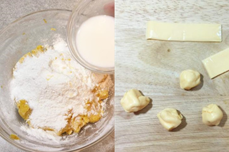 地瓜削掉外皮,切成小块,放入蒸锅里蒸熟。蒸熟后取出,用叉子黏成泥状,调入适量红砂糖,搅匀,再加入糯米粉和牛奶,混合均匀,揉成面团。芝士片切小块,揉成球状。