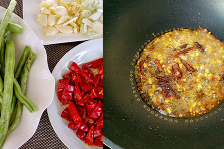 豆角挑选表面无伤的,然后放在水里清洗干净,另外还要注意豆角是否夹带虫子。洗好之后放在案板上用刀切成三段,然后放在盆子里备用。准备一块猪肉,切成碎末,好需要一些香葱和生姜,切好之后就准备炒菜了。锅底放食用油,可以多放一些,这样豆角炒出来更香一些,油热至八层,放入香葱和生姜爆香,当然少不了放一些干红辣椒。