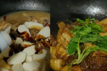 接着把煮鸡块的汤汁倒入锅里,调至大火煮沸再改成中火炖煮。山药削掉外皮,滚刀切块,鸡块炖了十分钟后,将山药下锅,烹入适量老抽和盐,加盖,继续炖二十分钟。然后将红薯粉丝下锅,用铲子将其推至锅底,继续炖煮,直至粉丝熟透。出锅前撒上些香菜即可。粉丝很容易煮熟,所以待鸡块快要炖熟时才将其加入锅里,下锅后也不要煮太久。