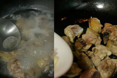 鸡腿洗净剁成小块,凉水下锅,大火烧开,撇去浮沫,盛出鸡块和汤汁待用。炒锅内倒入油,开火烧热,下鸡块煎炒。鸡块煎至双面焦黄时,加入冰糖、干辣椒、生姜和蒜瓣,翻炒均匀至冰糖融化。