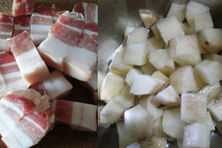 五花肉洗净切成长条,山药削掉外皮,切成小方块。