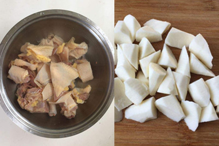 因为山药是一种非常容易氧化的食物,所以我们先处理鸡肉,买整只鸡的时候可以让店家帮忙清理内脏,然后拿回家后也要多次清洗,去除血污。清理干净之后,用刀把鸡肉分解开,切成小块后放进盆里用盐浸泡二十分钟。山药需要去皮,然后切成滚刀块,泡在水里,否则山药很快就会变黑的。准备一些葱花和生姜,然后拿出炒锅和砂锅备用。