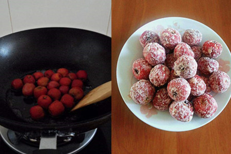 第四,等到糖汁儿的温度下降之后,包裹在山楂外表的糖汁儿变成白色的结晶即可。
