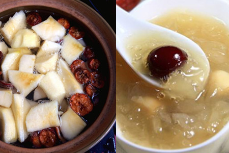 第三,取一个小炖盅,注入适量的清水,再放入银耳和木耳,调至大火煮开,然后转文火炖煮1h。待到时间到后,加入山楂片和雪梨丁继续炖煮20min。将起锅时候,放入冰糖煮融化即可熄火。
