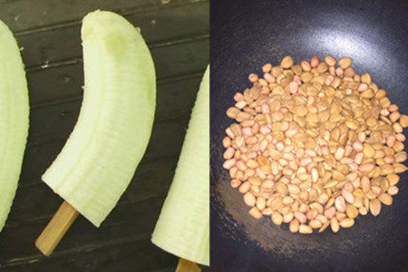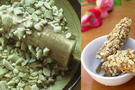 6、把煮好的糖浆从锅中取出,把冰冻好的香蕉取出,在上面用刷子均匀地刷上一层糖浆。把花生和杏仁碎倒入一个盘中,把刷过糖浆的香蕉放入其中,使其表面均匀地裹上一层花生杏仁碎。可以用手稍微按压一下,使花生杏仁不会散下来。把香蕉再放入冰箱之中,再冷冻上半个钟头便可食用了。