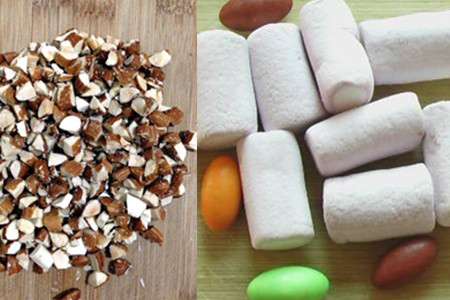 1、准备的食材有香蕉、花生、杏仁、巧克力豆、棉花糖。