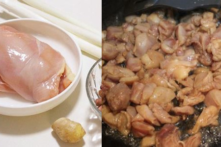 我们在把葱切成段,生姜切成丝儿,蒜剁成沫待用。再把炒锅预热后加入食用油,把腌制好的鸡胸肉倒在锅里,翻炒均匀后,把大葱和干辣椒加进去,等炒出香味后,加一点花椒粉,再把料汁倒进去,继续来回翻炒。这时候我们可以开大火翻炒,等鸡胸肉炒熟后,就可以关火了。这时候再把油炸花生米拿出来倒进锅里,搅拌均匀后就可以出锅了。