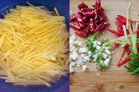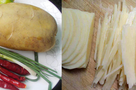 有人说食用大量淀粉会导致发胖的,这仅仅是单方面看问题,吃土豆会有饱腹感,同时热量也低。做一道酸辣土豆丝,不仅美味,还不用担心发胖。土豆事先需要去皮,外皮去除后放在清水里洗干净,然后拿出来用刀切成细丝。但是自己切不好的,也可以用专门工具做,非常便利。土豆去皮后,与空气接触很容易氧化变黑,所以我们要把土豆丝泡在水里。
