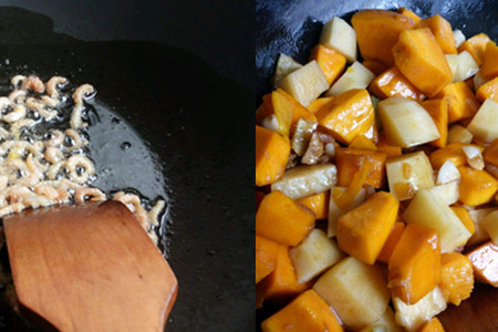 锅里放油加热,等待油温升至八层就放进去葱花,炒香后加一些生抽,然后把南瓜块倒进去。土豆比较容易熟,所以我们不用着急放进去,大力翻炒几次后加一些精盐。可以倒一些蚝油和鸡精,添适量的清水,用中火慢慢烧开。等到开锅之后,就可以倒入土豆块了,翻炒均匀中火盖上锅盖继续文火炖。
