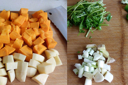 两者都是含糖多的食物,而且本身没有什么刺激性气味,颜色搭配也非常好看。南瓜的外皮比较坚硬,吃起来口感不是很好,所以我们需要去除外皮,然后放在清水里清洗,之后再用刀切成小块。土豆也是要去皮的,同样清洗干净后切成块,土豆块和南瓜块切成大小差不多的就可以。准备一些葱花和香菜,想放些猪肉也是可以的,猪肉切成片备用。
