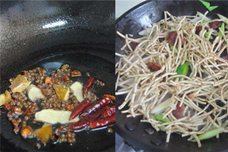 然后我们在锅中放入适量的油,等油热之后,放入干辣椒段、花椒、盐、姜、蒜等,盐可以少放一些,因为腊肉里面已经含有大量的盐了,将所有的调料进行炒香,接着我们加入切好的腊肉和折耳根,将它们进行适当的翻炒,等折耳根差不多熟了之后,我们放入一些葱段,就可以将做好的菜盛出了。