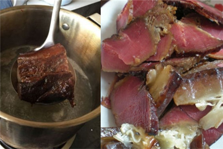 接着我们就可以处理腊肉了,首先,我们将腊肉放入锅中,加入适量的水,水要将腊肉淹过。然后用中火将腊肉煮半个小时,半个小时之后,我们将腊肉从水中捞出来,然后将腊肉切成合适的小肉片,将肉片上的水尽量沥干,这样炒肉的时候会比较方便一些。