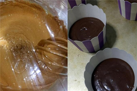 将蛋糕糊取出,倒入准备好模具中。烤箱预热至220度(必须高温,这样才会有岩浆馅心),烘烤八分钟左右。取出后需要马上吃,冷了就没有岩浆流淌的效果了,要小心烫嘴哦。