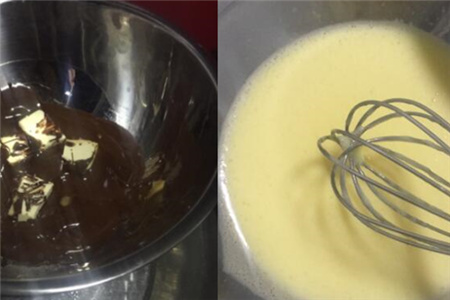 将黄油和巧克力切成小块,放入碗中隔水加热至融化。这里一点要隔水加热,千万不要图省力用微波炉去加热。微波炉加热后的巧克力基本上就没办法使用了,会完全干结在容器上。