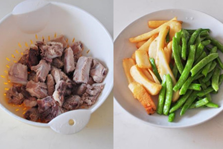排骨剁成大小合适的块状,用清水泡十分钟左右,再漂洗干净。煮锅内放适量清水,加入几粒花椒粒和洗净的排骨,大火烧开,捞出控干水分待用。马铃薯削掉外皮切成长条,豆角洗净择成长段。平底锅上灶,放油烧热,油热之后,下马铃薯条和豆角段煎制,马铃薯煎成表面焦黄,豆角段煎成表皮起泡,盛出待用。