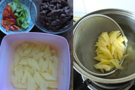马铃薯削掉外皮,切成小菱形片,放入清水中泡着。猪肝洗净切小片,青红椒洗净切小片。猪肝加入适量白糖、胡椒粉、料酒、白糖和淀粉、搅匀腌制片刻。马铃薯片用开水焯一下,捞出用清水冲凉。