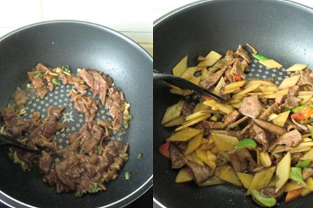 炒锅内倒油烧热,下香葱末和姜丝爆香,再倒入腌好的猪肝片煸炒,炒至无血色后盛出待用。接着将马铃薯片放入炒锅煸炒片刻,调入适量清水和酱油,撒入适量白糖和盐,炒匀。然后倒入青红椒片和炒好的猪肝,撒入少许鸡精,炒匀就可以关火装盘了。