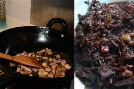 接着我们就可以制作梅干菜炒肉了,首先我们在锅中放入适量的油,等油沸腾的时候,将梅干菜放入锅中。将梅干菜进行不断地翻炒,等梅干菜差不多被炒干之后,我们在锅中加入适量的水,将锅盖上焖煮十分钟。加入料酒、生抽、鸡精、糖、盐和猪肉末,将它们翻炒均匀,炒至锅中的汤汁差不多被炒干的时候,就可以将梅干菜和猪肉盛起来了。
