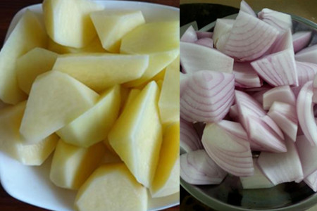 2、先将买回的土豆刨皮,洗净后切成滚刀块,置于一旁待用。洋葱撕去外表层的皮,洗净后切成小块状。西红柿择去蒂,清洗干净后用刀切成小块状。