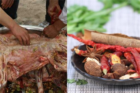 在烤制烤全羊之前,我们先要将整只羊进行腌制,可以将羊放在一个大盆里,然后在盆里加入生姜、花椒、辣椒,注意在腌制羊肉的时候要加入开水,因为开水可以将羊肉的细胞泡开,使羊肉将生姜、花椒、辣椒等的味道全部吸收,开水也能将生姜等调味料的味道泡出,这也算是烤全羊的一个小窍门。