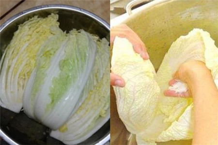 准备好这些配料之后,我们就可以正式的开始制作辣白菜。首先是将白菜清洗干净,然后将白菜切成四个部分,如果白菜比较大,可以多切一刀。切法是从根部开始,将白菜切成两半,然后再一次的将白菜切成等份的两部分,这样的切法是为了接下来的步骤。然后我们就将白菜一片一片的掀起来,在每一片上都均匀的撒上食用盐。