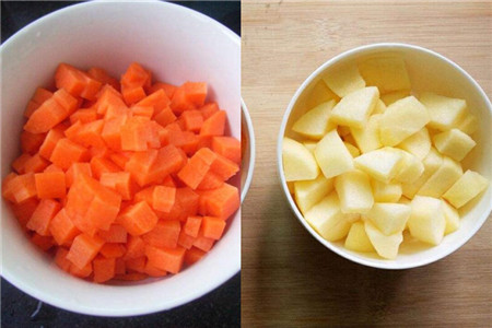 而撒上盐的白菜即可放在一个保鲜盒内保存,保存一晚即可,第二天我们打开保鲜盒的时候,就可以很明显的发现白菜已经变软,这就说明食用盐已经充分的将白菜内的水分渗出。这个时候我们就可以制作辣白菜的酱料,酱料的制作则会更加的简单,将我们事先准备好的胡萝卜、苹果和梨都切成小块待用,大蒜和大葱等配菜也需要切成小末待用。
