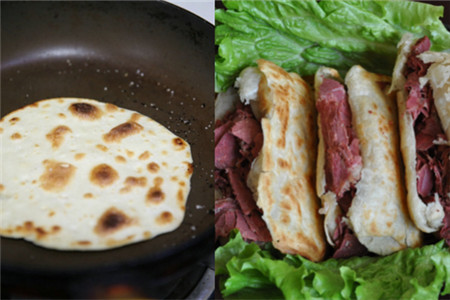 然后我们在锅中加入适量的油,等油热之后,将面饼煎熟,之后,我们再将面饼盛起来备用,接着我们在干净的锅中同样加入适量的油,放入葱姜蒜段,接着再放入驴肉,等驴肉炒至发白,放入切好的青椒、洋葱等食材,将它们炒熟,放入适量的盐、生抽、味精等,调味料可以稍微放重一些,接着我们将驴肉加入做好的面饼中,驴肉火烧就做好了。