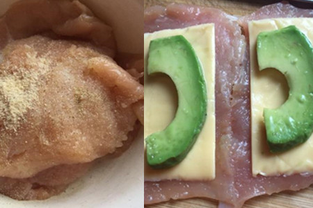 牛油果洗净,削掉外皮,切成薄片,装入碗中,调入适量蒜盐和柠檬汁,拌匀腌制片刻。取两片腌好的鸡肉片,分别先后放上芝士片和牛油果片,再把鸡肉片合起来,均匀地裹上干淀粉。