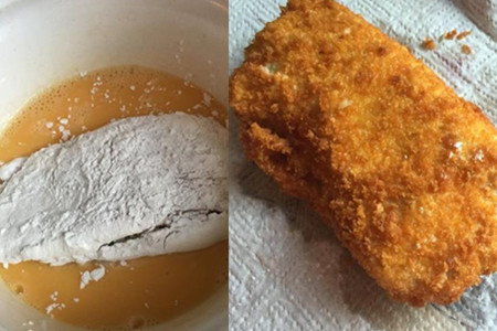 鸡胸肉清洗干净,顺着其纹理将其切成薄薄的两片,但是不要切断,再用刀背轻轻地拍松。把拍松的鸡胸肉片装入碗中,加入适量鸡粉、胡椒粉、盐和料酒,用手拌匀,腌制两个小时左右。