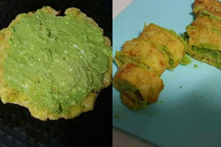 电饼铛插电预热好,倒入少许玉米油,用刷子涂抹均匀,再将面糊倒入并且摊开,一面烙至定型后才翻另一面。双面烙至金黄酥脆后,往其中一面抹上牛油果奶酪泥,卷起压实,切成小段即可食用。