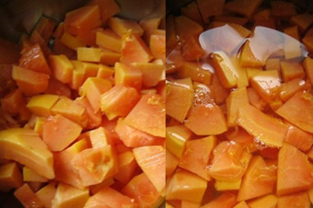 清水不要加入太多了,不然这道甜品的味道就会比较淡,一定要视木瓜的量来决定放入的水,不要贪多。