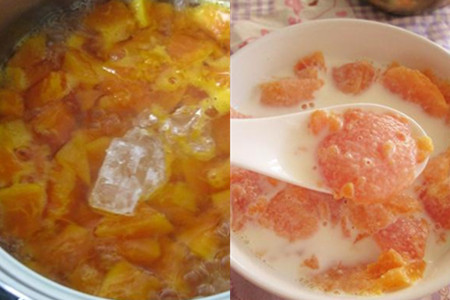 倒入适量的水以后再往锅中加入的冰糖,喜欢甜一点的就多放一点。大火将锅中的水煮开,用锅铲将木瓜搅拌一下,让冰糖彻底溶解。然后倒入牛奶煮1分钟就可以关火了。将锅中的牛奶和木瓜稍微搅拌一下,盖上锅盖焖3分钟就可以将它盛起来了。这个时候的木瓜非常软,口感也是非常好的。找一个安静的地方静静的享受美味就是接下来要做的事情。