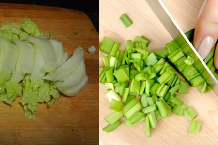 接下来就是处理一下基本的食材了。先是主要的白菜。白菜分为菜帮和菜叶两部分,很多人喜欢吃菜叶,不喜欢吃菜帮,其实两者营养是一样丰富的,菜帮水分更多,更有嚼劲。把洗好的菜叶子整齐码好,放在菜板上,用菜刀切成大小均衡的小片就行了。菜帮部分可以切得细一点,因为翻炒的时候不容易熟,菜叶部分就大一点就好了。