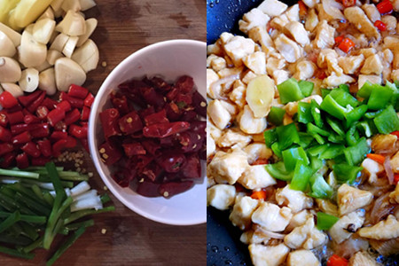买鸡胸肉的时候不要买冷冻的,因为不新鲜,这道美食要求食材要新鲜,这样做出来的鸡肉口感比较好。买回来的鸡肉,我们放在水里撒一些精盐浸泡二十分钟,可以去除异味。泡好的鸡肉,放在案板上用菜刀切成小立方块,宽度为一厘米左右为宜。然后开始准备配料,其中必不可少的就是青红辣椒,两种颜色的辣椒搭配在一起非常好看,再准备些麻椒。