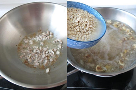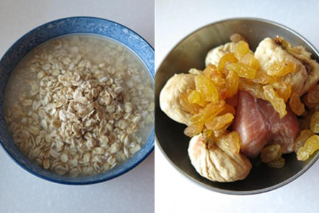 食材:大米30克、糯米30克、燕麦片30克、无花果4个、白葡萄干1把、瘦肉100克、香葱、盐、油。