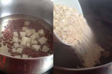 红豆提前浸泡一夜,再漂洗干净。山药削掉外皮,切成小丁,用清水泡着。锅内放入适量水,加入红豆和山药块,开大火煮沸后转为小火慢炖。红豆炖酥烂之后,开盖,倒入燕麦片,转为大火煮沸,一次熬煮一边用勺子搅拌,煮到自己喜欢的浓稠度即可关火。红豆比较难煮熟,所以事先浸泡一夜。