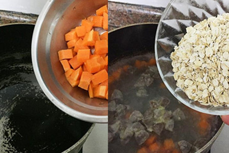 食材:燕麦100克、胡萝卜100克、肉丸100克、盐、水。