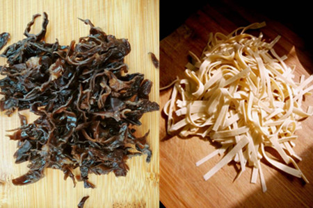2、先将木耳事先浸泡在清水之中,浸泡软后捞出择去蒂部,放在流水下冲洗干净。再把木耳放在菜板上,用刀切成细丝。