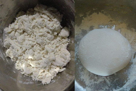 2、在一个大盆之中倒入适量的面粉,往里倒入多次倒入些许的清水,用筷子搅拌成絮状。再用手揉搓成面团,一定要反复揉搓至面团不粘手为止。把揉好的面团放回盆中,在上面覆盖上一层湿纱布,放在一旁饧上十五分钟左右。