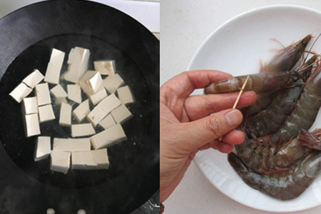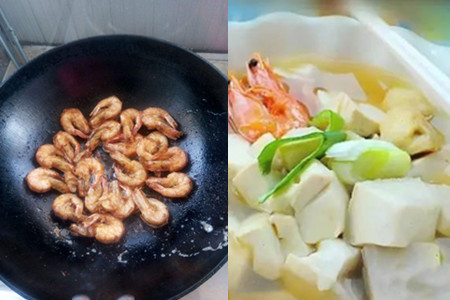 6、将适量的开水倒入砂锅中,紧接着把鲜虾、芋头块、生姜、葱段逐一加入砂锅之中,汤汁大火烧开后,改为小火慢慢炖煮十五分钟左右。煮的时候,用漏勺不断将汤汁表面的浮沫撇掉。这时候再把豆腐块放入其中,煮上五分钟。临出锅前,撒上些胡椒粉、鸡精,淋些香油便可食用了。