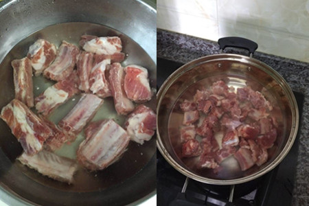 3、将适量的清水倒入煮锅之中,加入少量的料酒,水烧开开始冒泡后。把洗净的排骨全部下入沸水中,焯煮几分钟,便可用漏勺捞出,置于一旁待用。