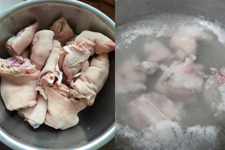 2、先将刚买回的新鲜的猪蹄用夹子拔掉上面的细毛,用刀剁成大小适当的块状。将适量的自来水倒入一口煮锅之中,水烧开沸腾冒泡后。把猪蹄块全部放入沸水中,焯一遍水。再用漏勺捞出,放在流水下,冲洗掉表面的浮沫,置于一边待用。
